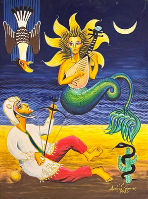 Em algumas obras, o realismo fantástico se impõe com força: livros, chaves, escadas e corpos suspensos introduzem uma dimensão metafísica, onde o conhecimento, o sonho e o mistério coexistem de forma natural. Não há ruptura entre o real e o simbólico — ambos fazem parte do mesmo campo narrativo.